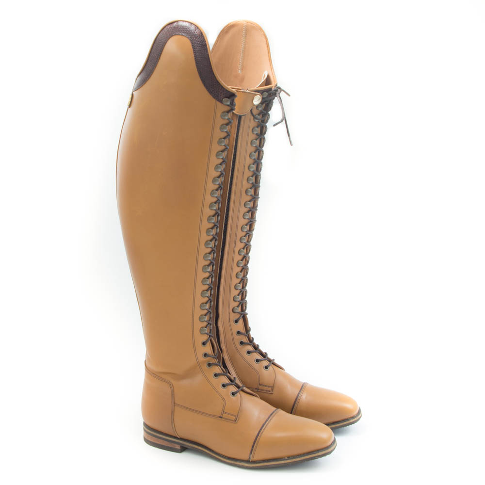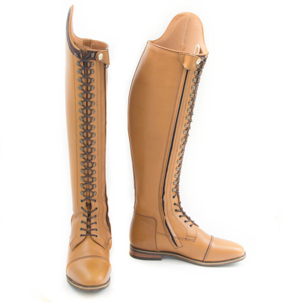 Dressage boots in light brown with full front lacing up to the knee. Thanks to the lacing, they offer up to 2 cm of flexibility in the calf area.